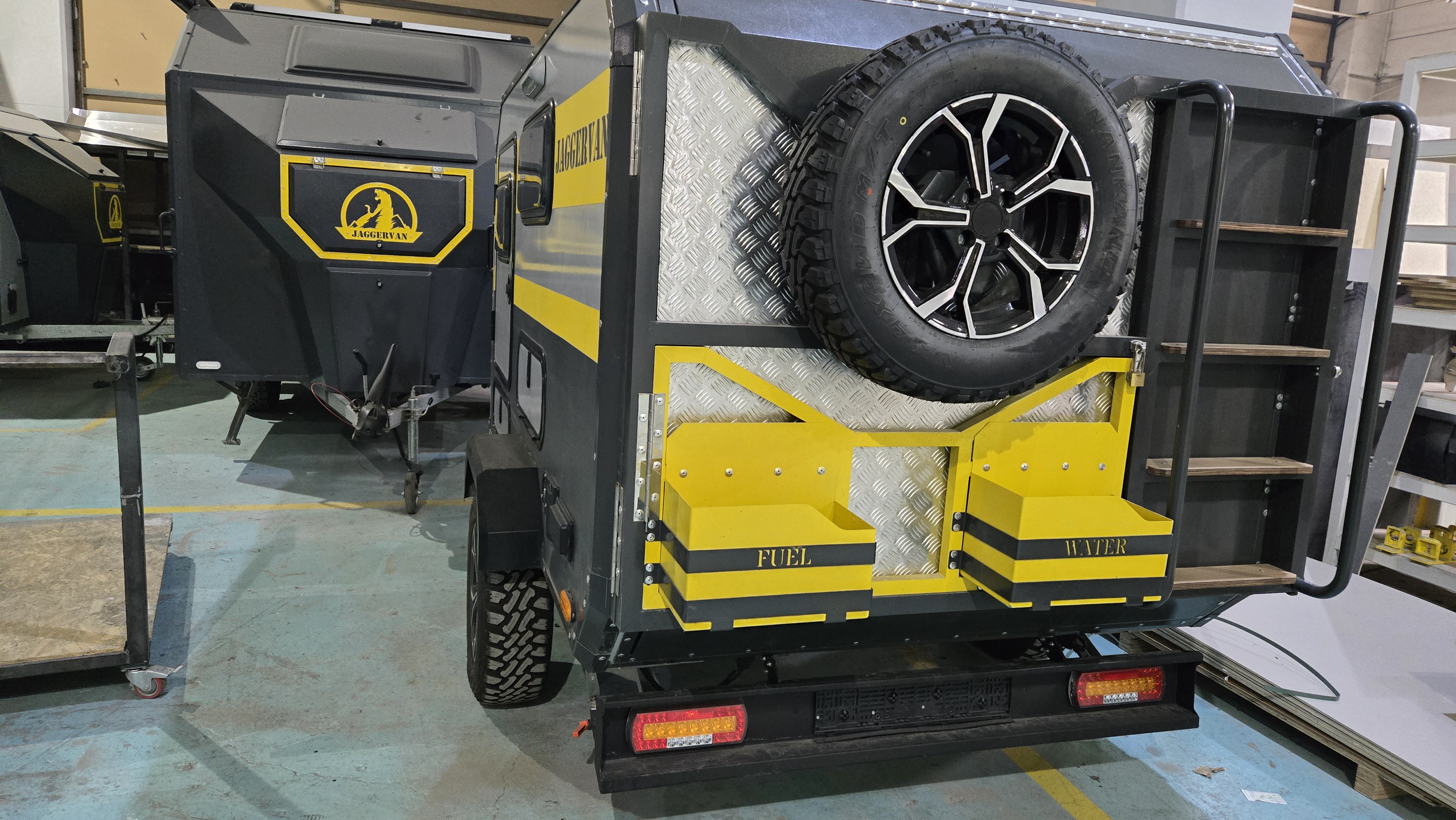 Compact off-road caravan by Jaggervan — built for freedom and adventure. Durable composite body insulated for all seasons, with a 193×160 cm double bed, external kitchen with 1100 L storage, and reinforced Knott chassis for all terrain.